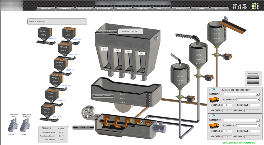 Le SCADA (Supervisory Control And Data Acquisition) est un logiciel développé sur mesure en fonction des réalités propres à l’entreprise qui en fait l’acquisition. On y retrouve une schématisation de l’usine, en plus de la modélisation de différents équipements, ainsi que du cheminement des activités de production.