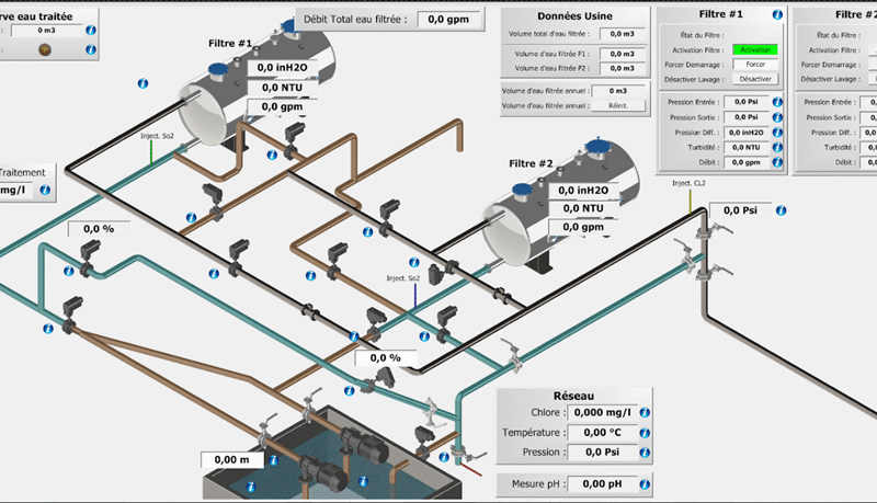 Exemple d’un système de contrôle industriel SCADA permettant de gérer un procédé dans une usine de pétrochimie ou de traitement d’eau.
